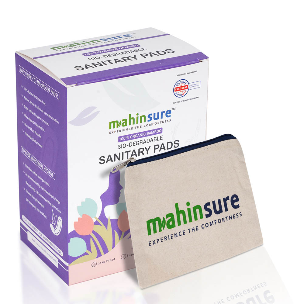 Mahinsure organic bamboo fibre sanitary pads, a jumbo pack of 22 pcs (Regular 245mm – 8 pcs, Medium 290mm – 8 pcs, Max. Flow 350mm – 6 pcs + Canvas pouch) skin-friendly, biodegradable, and compostable. India’s first sanitary pad certified by Dermatest, Germany.